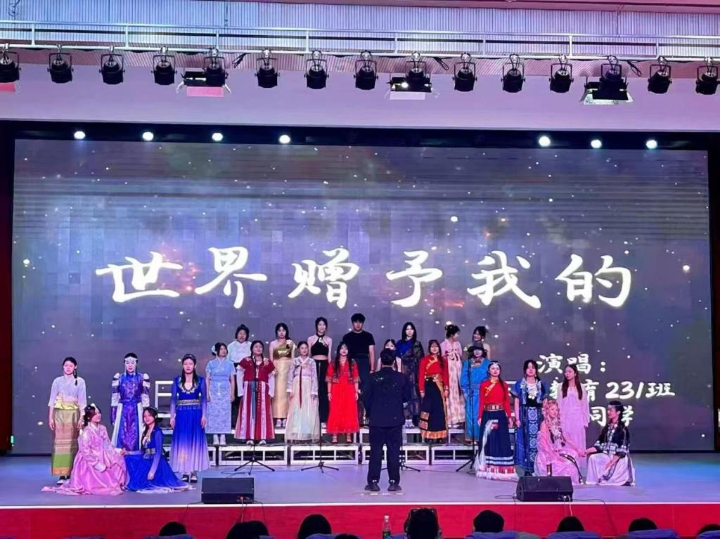 随着舞台灯光渐亮,大屏幕上锦绣山河展,歌曲《万疆》旋律悠悠响起。舞者们把对祖国山河的赞颂、对家国的热爱,都融进这扇影蹁跹里,拉开了合唱比赛的序幕。